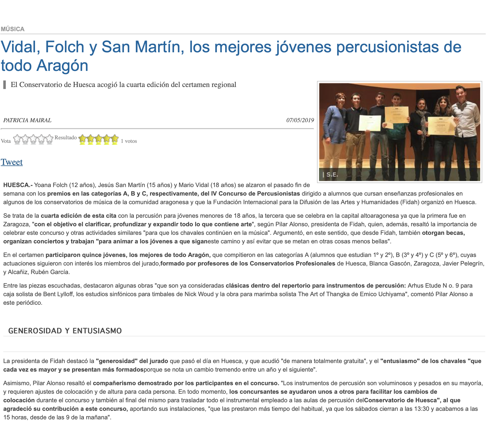 Un año más y organizado por el APA se ha celebrado en el Conservatorio Profesional de Música de Zaragoza el V Concurso de Interpretación Musical “Pilar Bayona”. Hay que destacar la gran participación tanto cuantitativa como cualitativa de los alumnos que ha hecho del concurso un rotundo éxito.